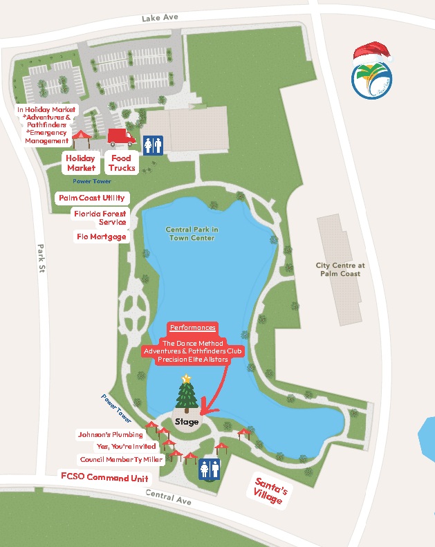 Join us Saturday, December 20th at Central Park in Town Center as well celebrate the 20th Anniversary of the Fantasy Lights Festival, a Palm Coast tradition presented by the Rotary Club of Flagler County. In addition to the 57 different lights displays throughout the park through December 30, Saturday's festival will feature a Holiday Market from 4-9pm featuring dozens of vendors, 17 food trucks, live holiday performances by the Dance Method, Adventures & Pathfinders Club, Precision Elite Allstars, a special 20th Anniversary Commemoration Ceremony at 6:30 and holiday tunes from musician Kevin Quinn from 7-9pm, plus much more! Event map featured below: