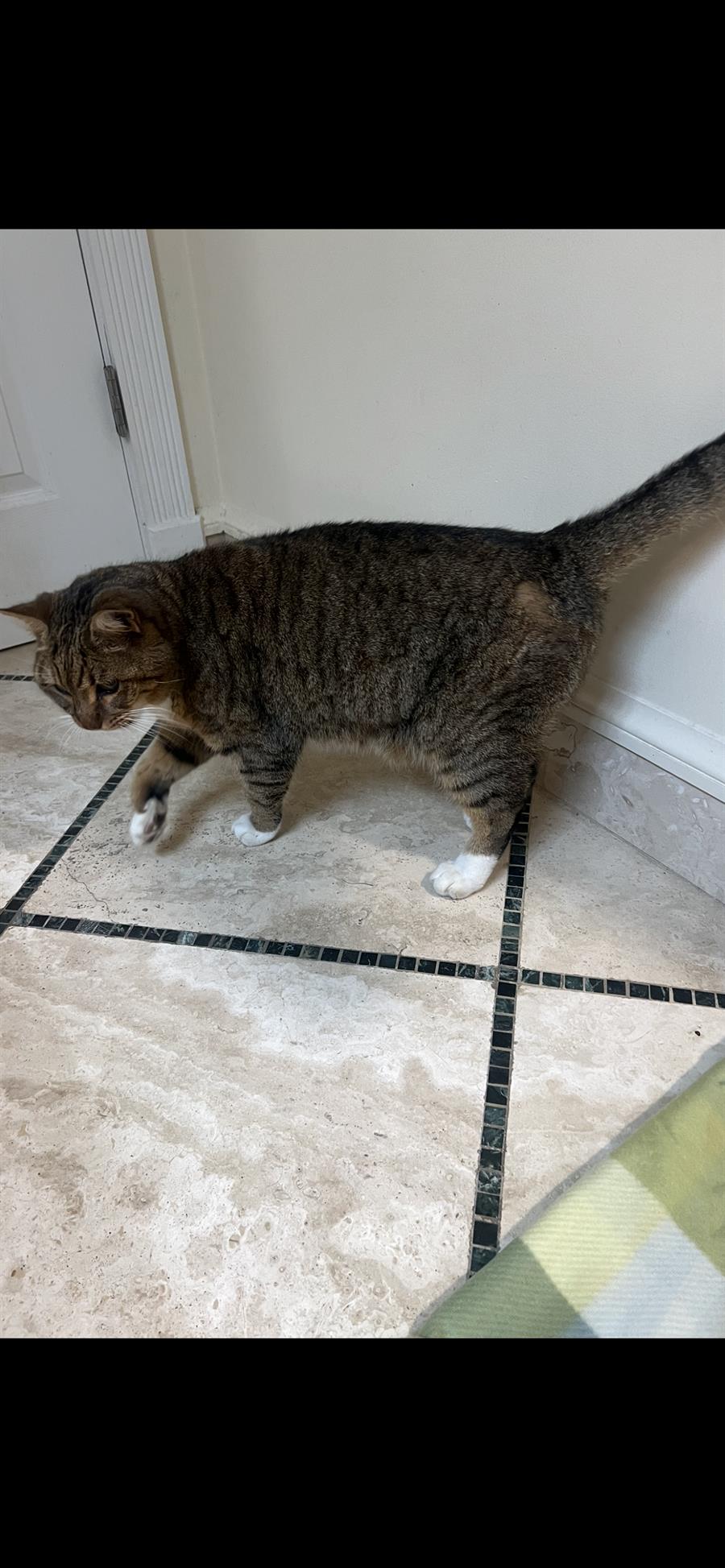 Tiger-striped with white on paws and chest. Has fur shaved off in a spot on his side by a vet.