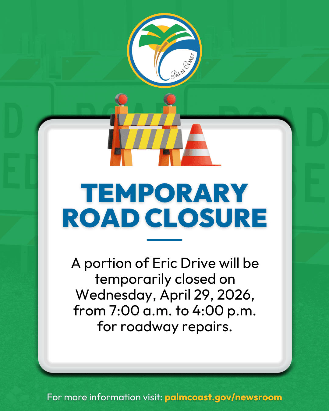 The City of Palm Coast will close Eric Drive at house number 117 on Wednesday, April 29, 2026, from 7:00 a.m. to 4:00 p.m.