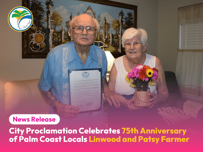 The City of Palm Coast congratulates Linwood and Patsy Farmer on this milestone and thanks them for their decades of love, service, and community spirit. Stay informed with the latest news and information from the City of Palm Coast by following us on Facebook, Instagram, Twitter, YouTube, and LinkedIn. You can sign up for weekly updates by visiting www.palmcoastgov.com/government/city-manager/week-in-review