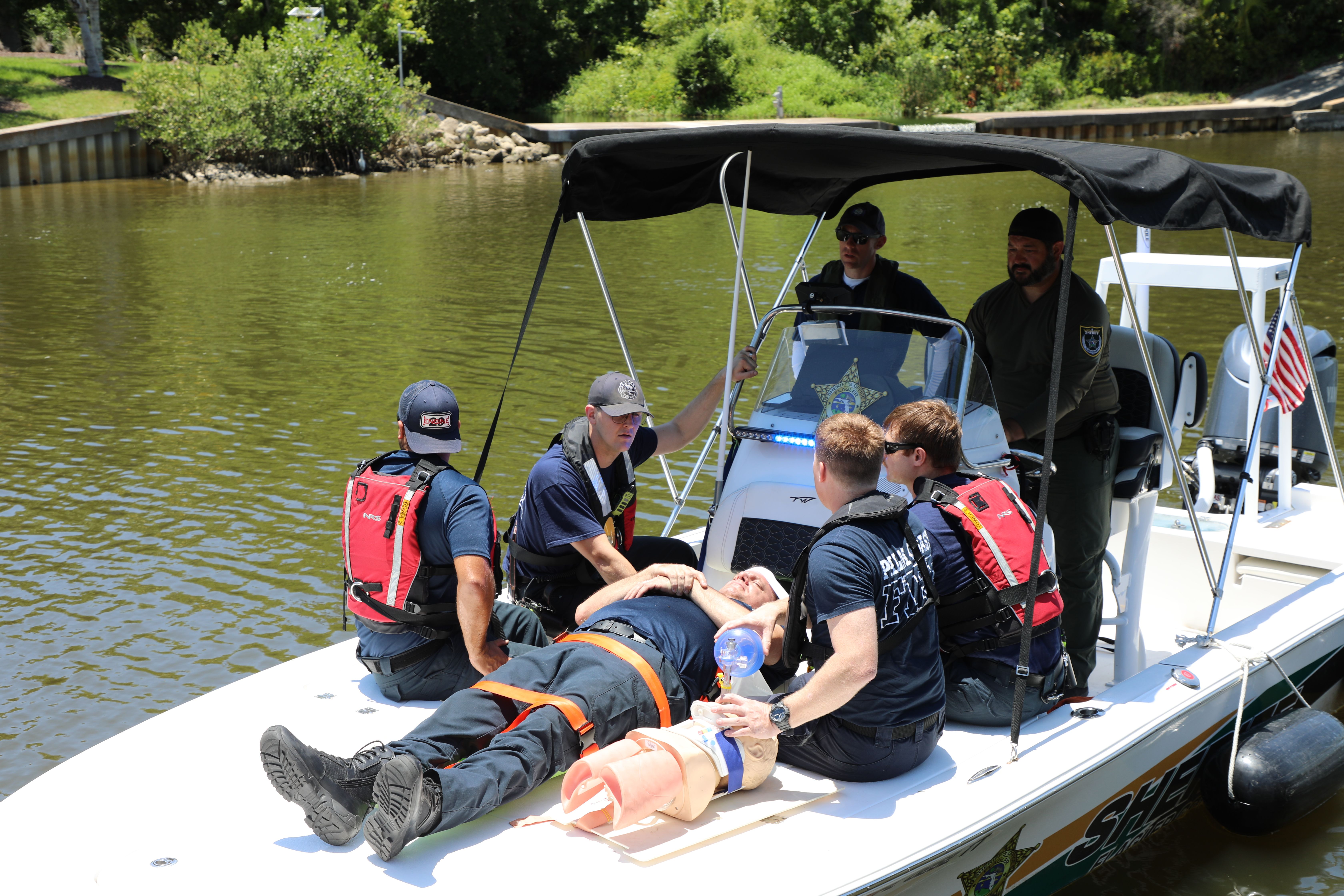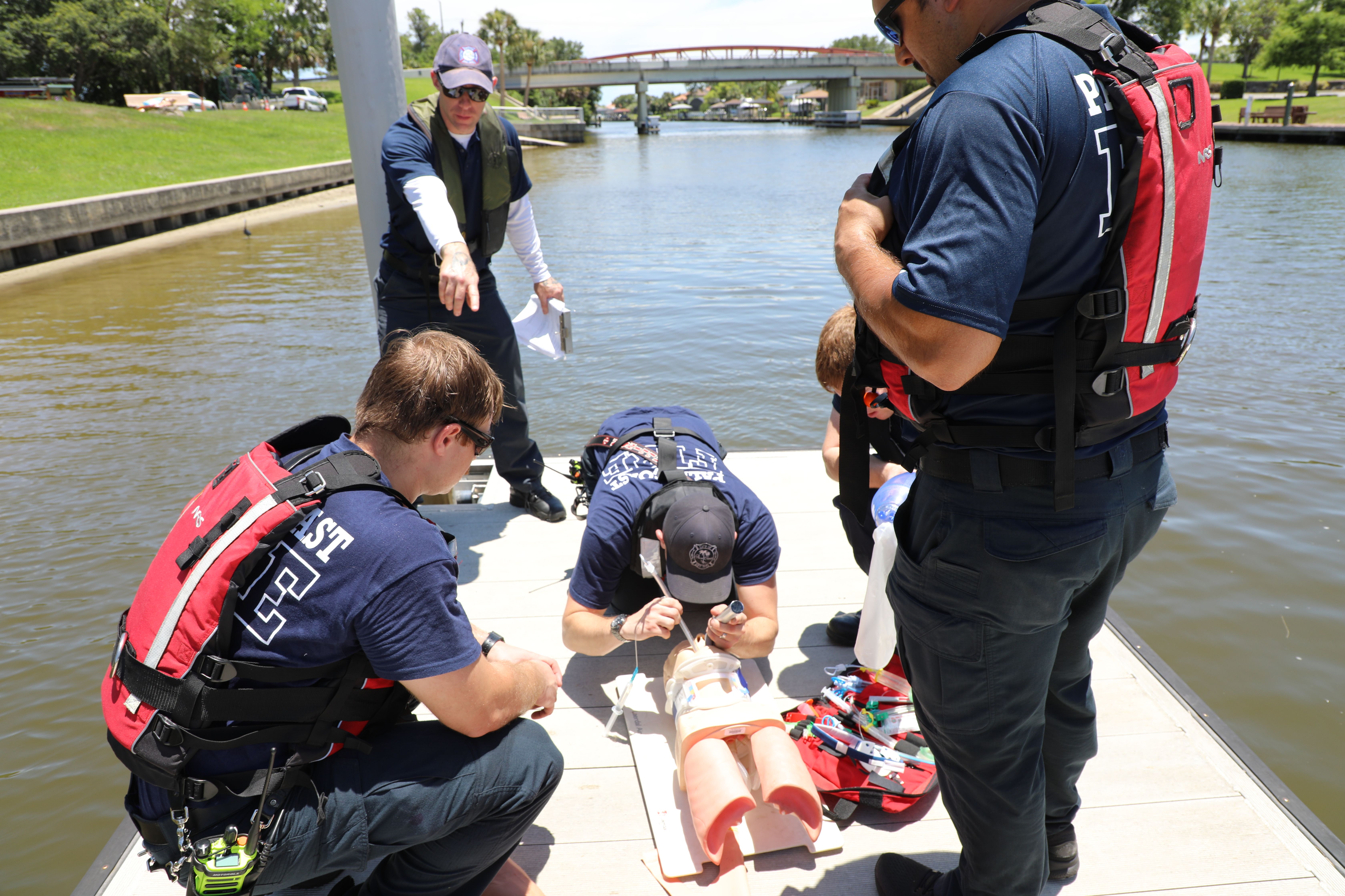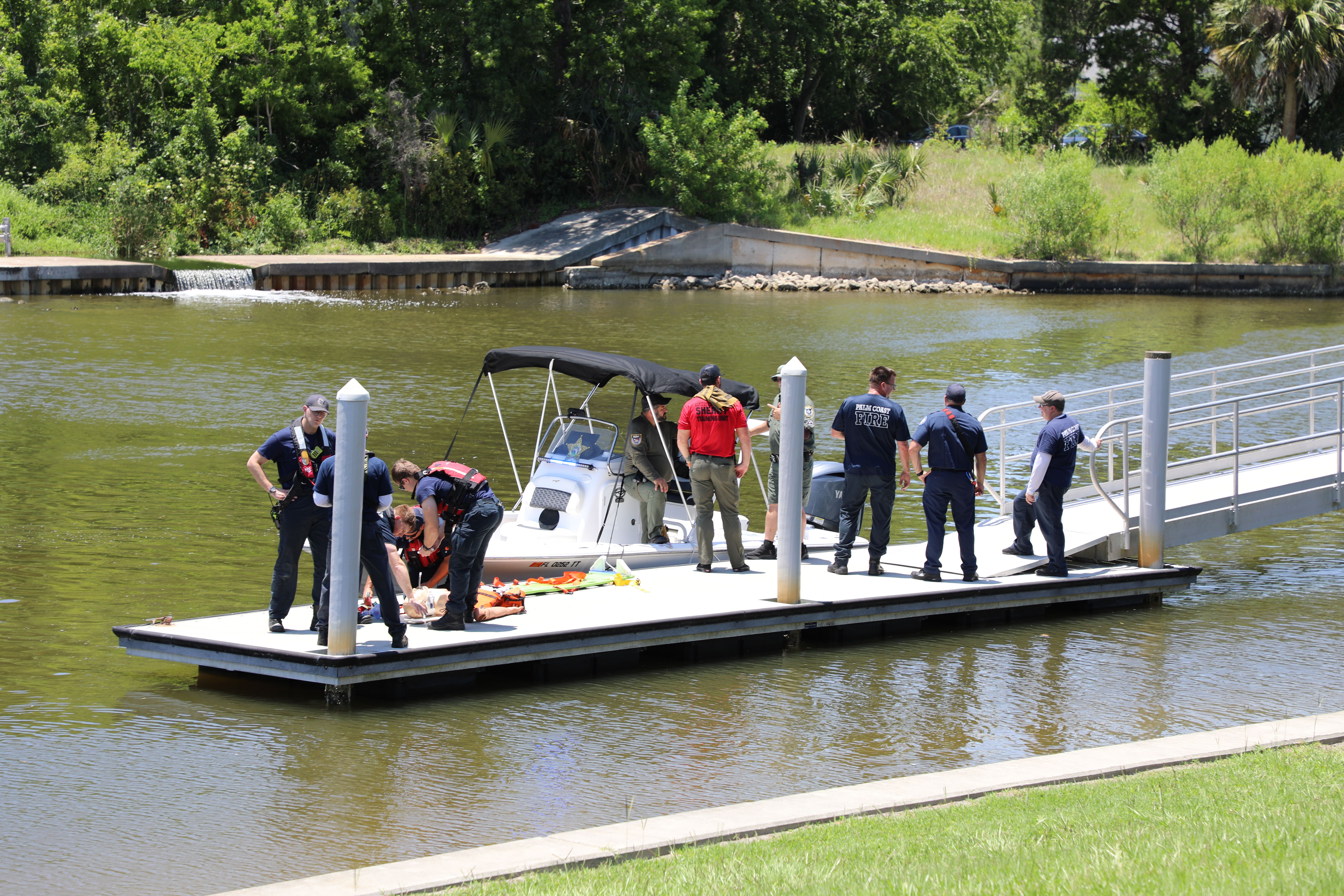 Held at the Long Creek Nature Preserve, the exercise saw the two agencies responding to simulated emergency calls in which a victim of a jet skiing accident needed serious medical attention. Each scenario incorporated the use of one of five boats provided by the Flagler County Sheriff’s Office, who worked collaboratively with the Fire Department to engage, stabilize and transport the patient safely back to shore abord the vessel so that emergency medical procedures could be implemented.