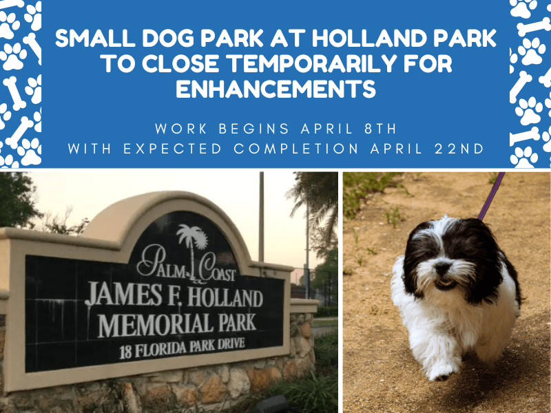 The small dog park at James F. Holland Memorial Park will be temporarily closed for improvements beginning Monday, April 8th, and is scheduled to reopen on Monday, April 22nd. These improvements are aimed at enhancing the overall experience for Palm Coast’s furry friends and their owners.