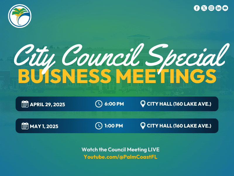 Stay informed with the latest news and information from the City of Palm Coast by following us on Facebook, Instagram, Twitter, YouTube, and LinkedIn. You can sign up for weekly updates by visiting www.palmcoastgov.com/government/city-manager/week-in-review.