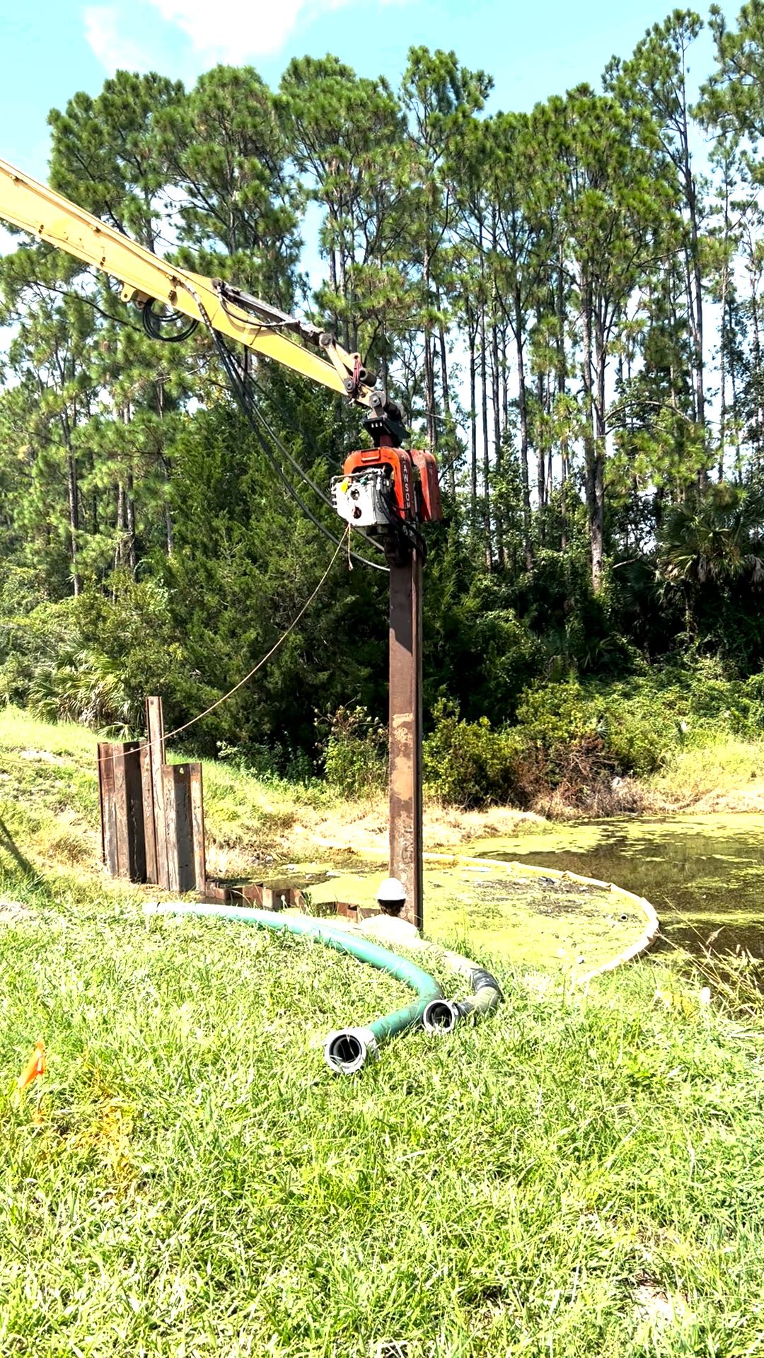 Construction activity continued in September as crews completed installation of sheet pilings on the east side of Belle Terre Parkway along the water. This work helps stabilize and support the project area as the new weir infrastructure is built.